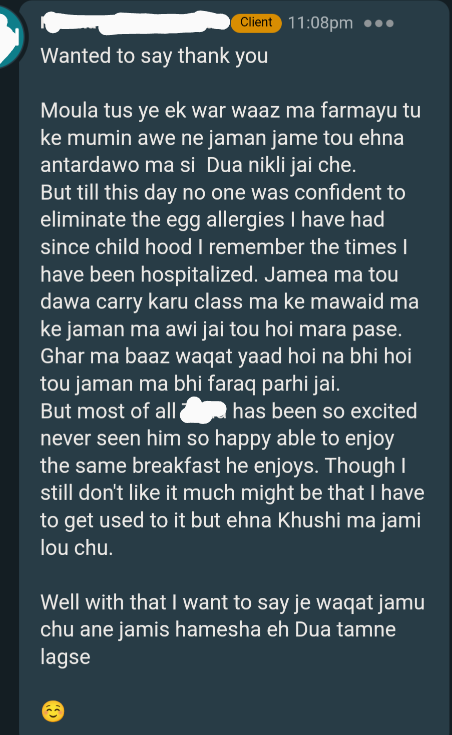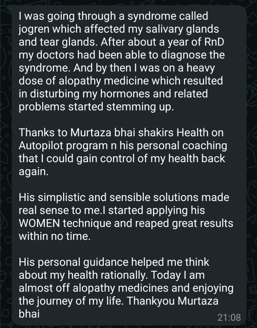 Murtaza bhai Shakir worked very hard in order to just make be believe that I can come out of this condition and can again live a normal healthy life which one would always look for. I too had kept a complete faith upon him and strictly followed all his instructions till date and would like to tell that today I have overcome this disease and living a healthy normal life.
