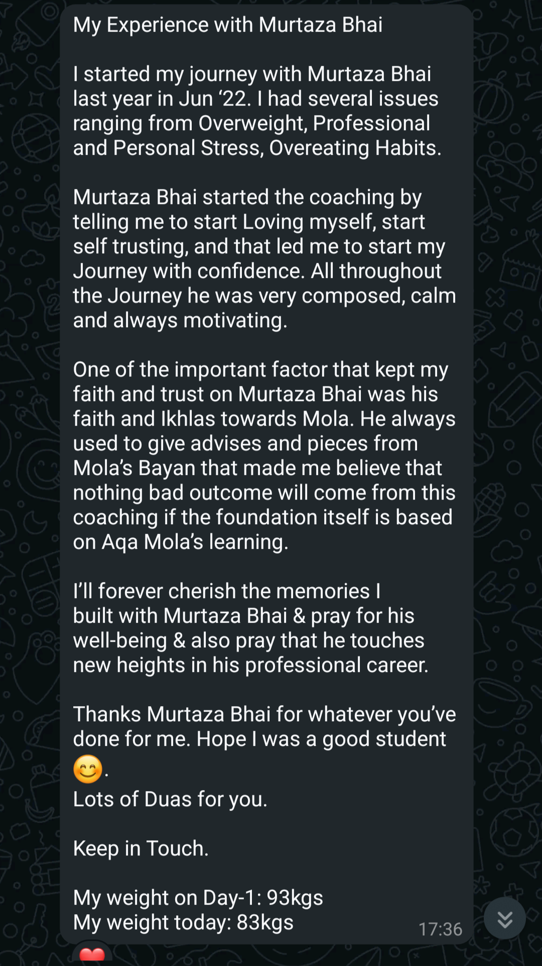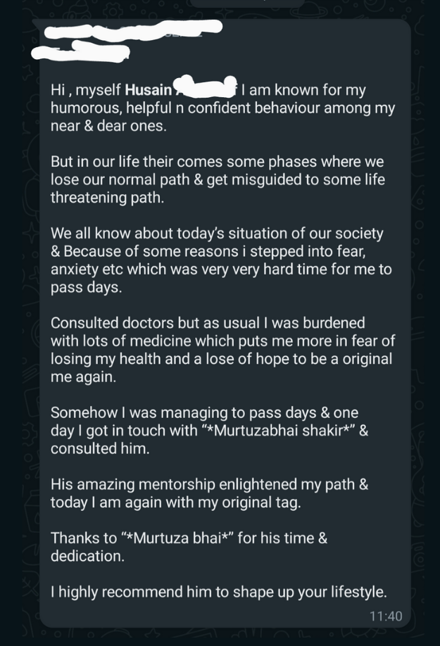 His amazing mentorship enlightened my path & today I am again in touch with my original self. Thanks to “Murtuza bhai” for his time & dedication.