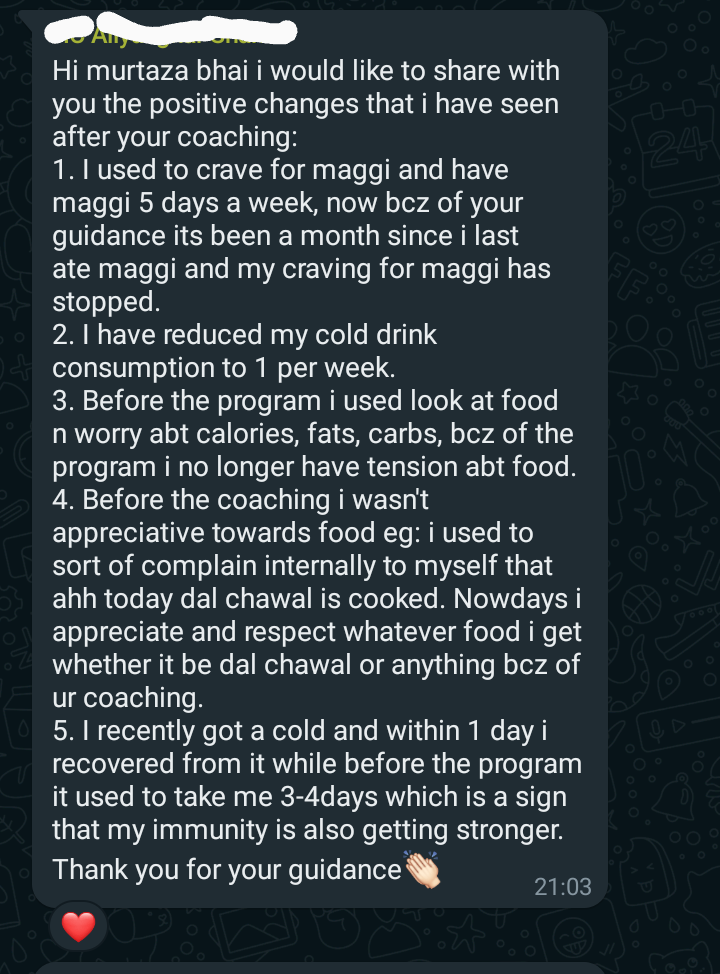 The coaching program helped me change my mindset towards eating food and helped me build healthier habits and strong mindset.