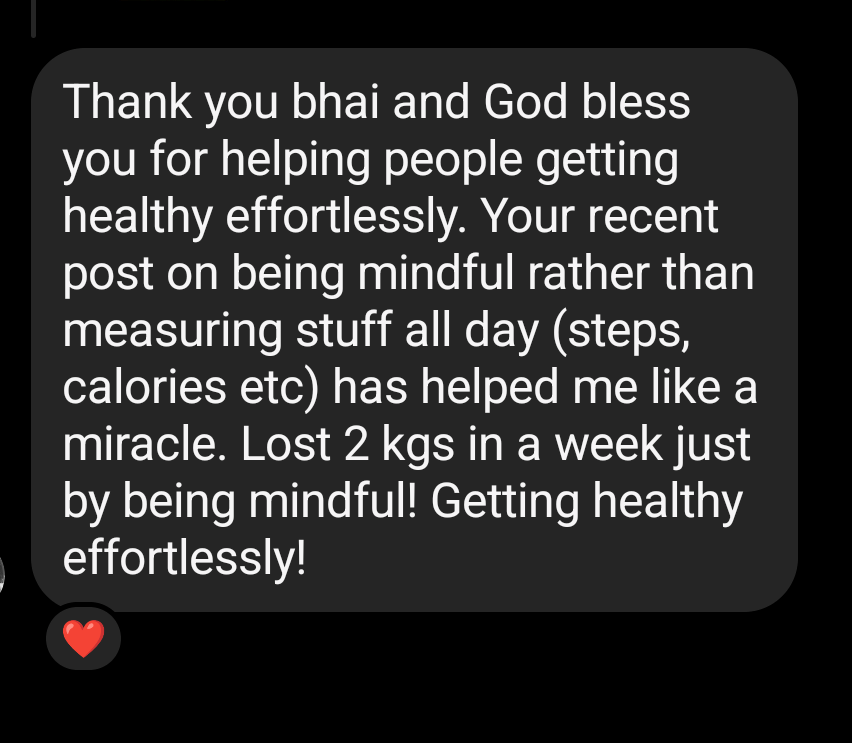 I am more mindful about what I eat and take my time with food and with less quantity of food I feel sufficient.